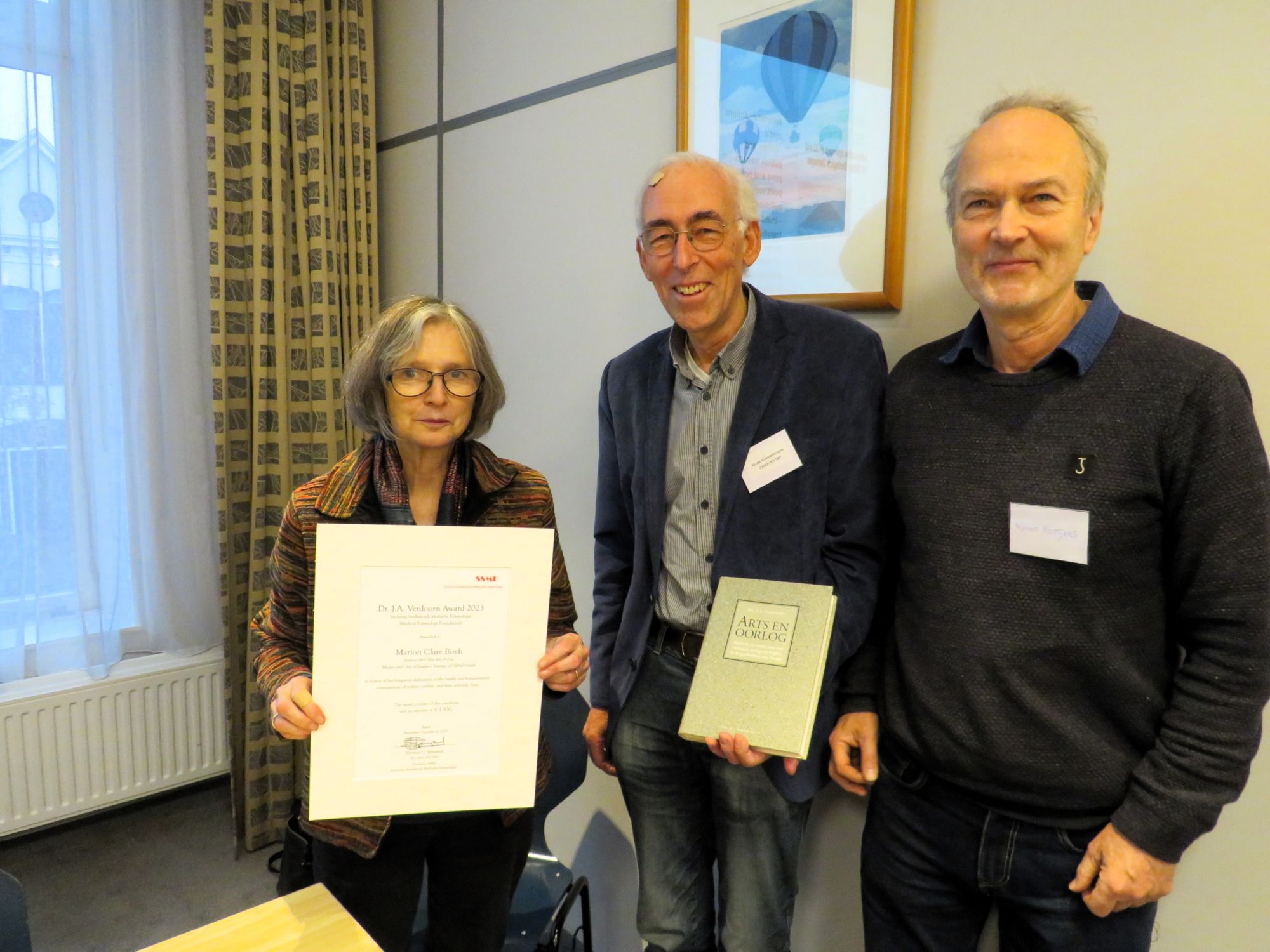 Tijdens de Algemene Ledervergadering van de NVMP-Artsen voor vrede ontvangt Marion Clare Birch, BAHons SRN SRM MSc PGDip Medact and Univ of London’s Institute of Global Health in honor of her long-term dedication to the health and humanitarian consequences of violent conflict, and their scientific basis, uit handen van Henk Groenwegen en Wijnand Rutgers van de SSMP , de Verdoornprijs 2023
