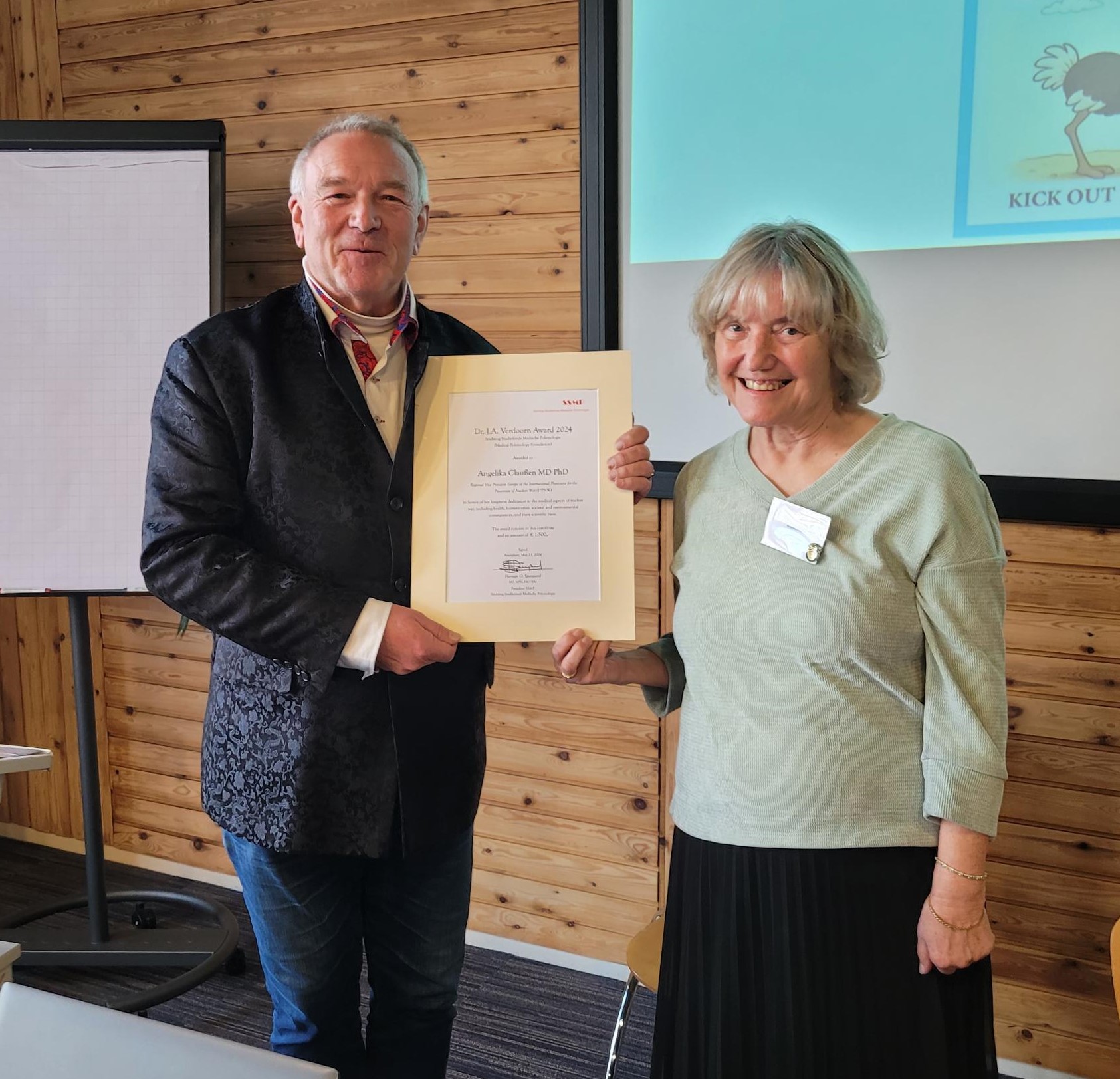 Tijdens het NVMP-symposium Hoe beïnvloeden democratie, kernwapens en klimaatverandering elkaar? op zaterdag 22 november in Amersfoort, werd door Herman Spanjaard, voorzitter van de Stichting Studiefonds Medische Polemologie (SSMP), de Verdoornprijs uitgereikt aan Angelika Claußen, MD PhD Duo Regional Vice President Europe of the International Physicians for the Prevention of Nuclear War (IPPNW), in honor of her long-term dedication to the medical aspects of nuclear war, including health, humanitarian, societal and environmental consequences, and their scientific basis.